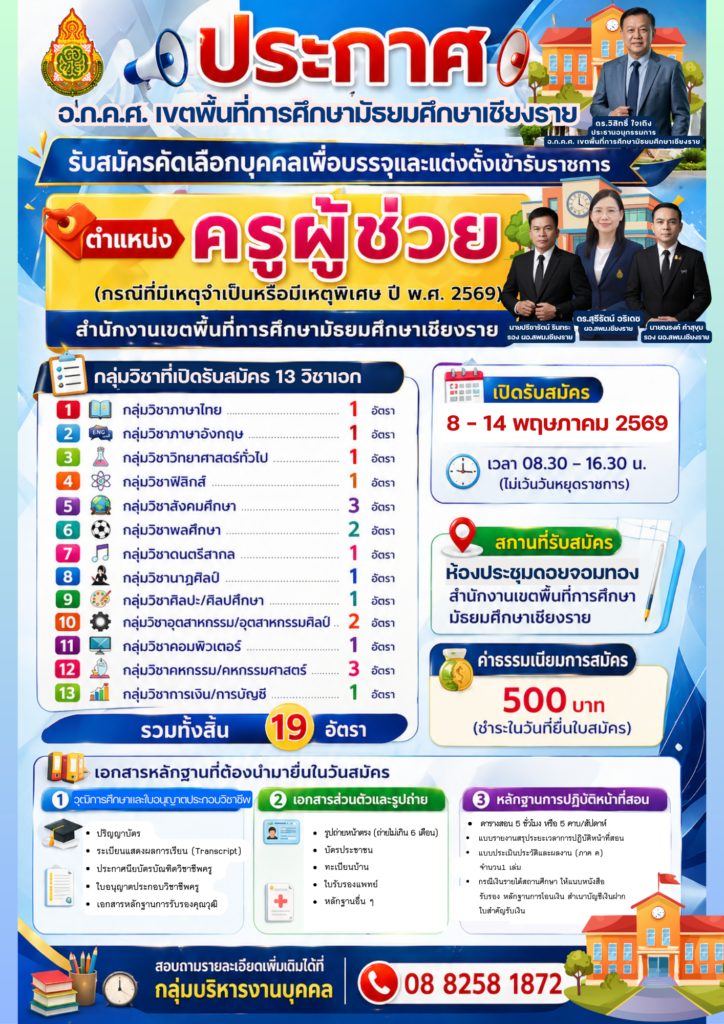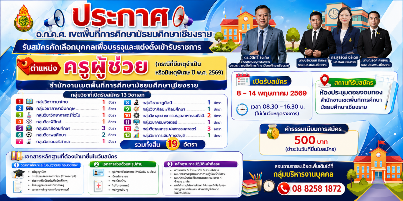 ประกาศสำนักงานเขตพื้นที่การศึกษามัธยมศึกษาเชียงราย เรื่อง รับสมัครคัดเลือกครูผู้สอนภาษาจีนสังกัดสำนักงานเขตพื้นที่การศึกษามัธยมศึกษาเชียงราย จำนวน 1 อัตรา ครูผู้สอนภาษาจีนปฏิบัติงานโรงเรียนเชียงของวิทยาคม