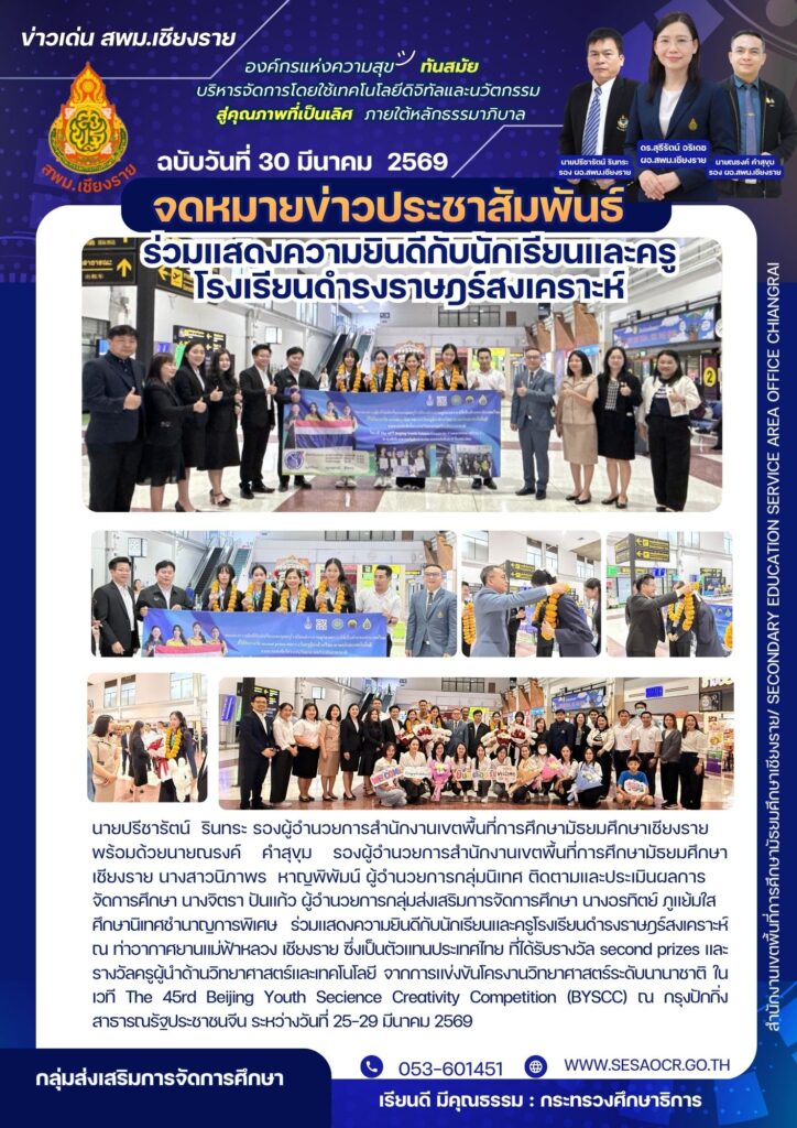 สำนักงานเขตพื้นที่การศึกษามัธยมศึกษาเชียงราย ขอแสดงความยินดีกับนักเรียนและครูโรงเรียนดำรงราษฎร์สงเคราะห์ ซึ่งเป็น ตัวแทนประเทศไทย คว้า 2 รางวัลระดับโลก เวทีวิทยาศาสตร์นานาชาติ ณ กรุงปักกิ่ง 30 มีนาคม 202630 มีนาคม 2026 ข่าวประชาสัมพันธ์ สพม.เชียงราย จำนวนผู้ชม: 11 PR SESAOCR30 มีนาคม 2026