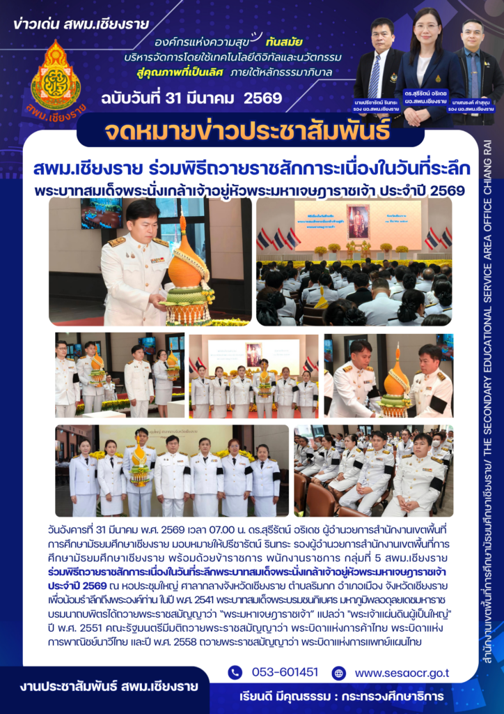 ร่วมพิธีถวายราชสักการะเนื่องในวันที่ระลึกพระบาทสมเด็จพระนั่งเกล้าเจ้าอยู่หัวพระมหาเจษฎาราชเจ้า ประจำปี 2569 31 มีนาคม 202631 มีนาคม 2026 PR SESAOCR ข่าวประชาสัมพันธ์ สพม.เชียงราย จำนวนผู้ชม: 6